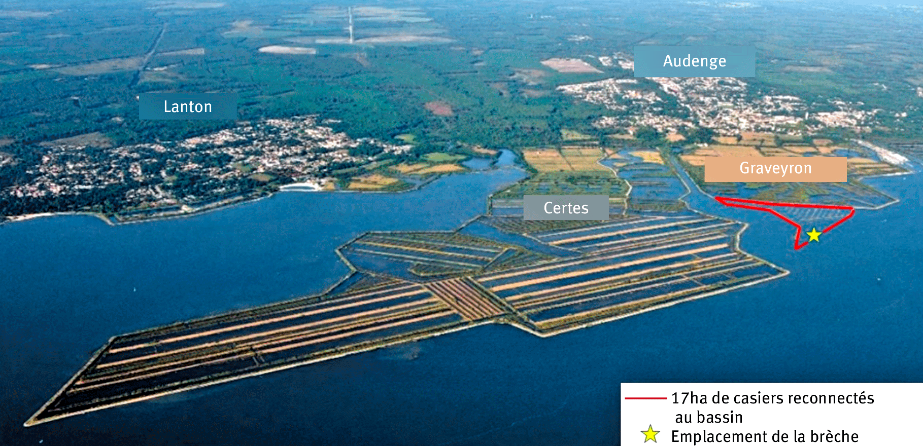 Sur le domaine de Graveyron, la reconnexion marine suite à la brèche de 1996 a effectivement permis la sédimentation et l’exhaussement de l’estran (figure 3), un moyen d’atténuer les effets de la houle (Goeldner-Gianella et Bertrand, 2014). En 2017, la DGPAT propose de réitérer l’expérience : pourquoi ne pas appliquer cette approche sur la digue de premier rang du domaine de Certes, endommagée par des submersions ?