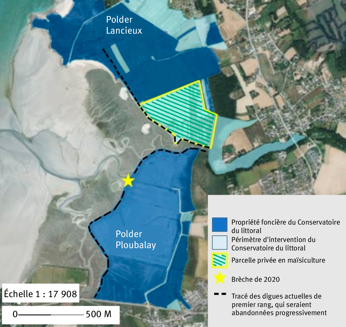 - 5. Sur ces deux sites, plusieurs digues protègent les espaces arrières des submersions marines. Le CDL ainsi que ses gestionnaires de site, ont laissé deux brèches, survenues à des dates différentes (la première en 1996 sur le domaine de Graveyron, et la seconde en 2020 sur le polder de Ploubalay), « évoluer librement », c’est-à-dire qu’ils ne sont pas intervenus pour les réparer, mais ont au contraire suivi l’évolution de ce trou formé dans la digue au fil du temps.