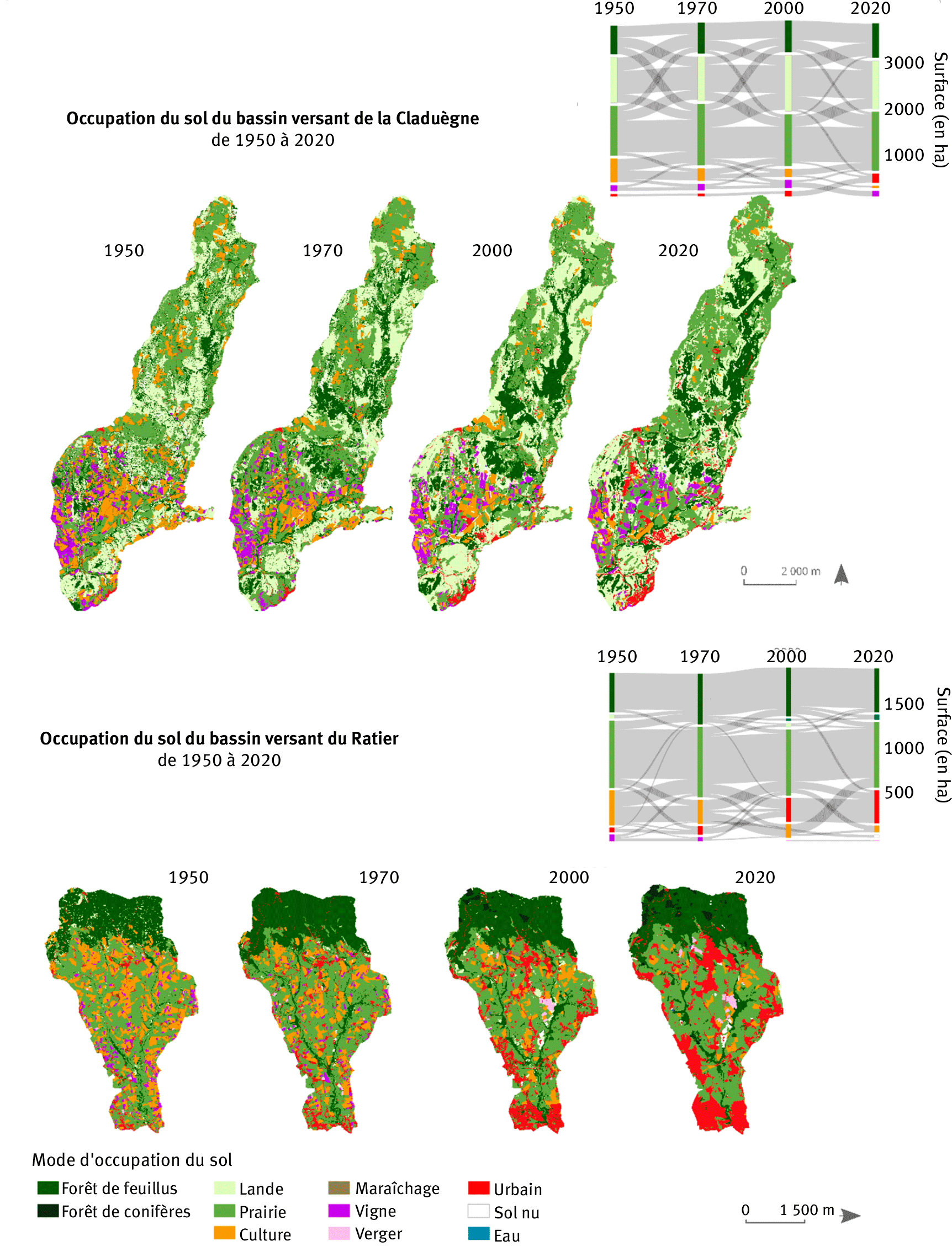 Figure 2. Cartographies d'occupation du sol synchroniques du bassin versant de la Claduègne et du Ratier, avec les changements quantifiés par le diagramme de Sankey.