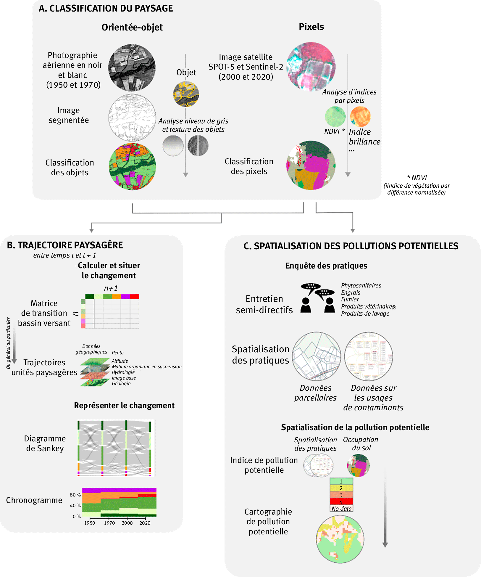 Figure 1. Méthodologie générale de la classification du paysage à la spatialisation des pollutions potentielles et à la trajectoire paysagère.