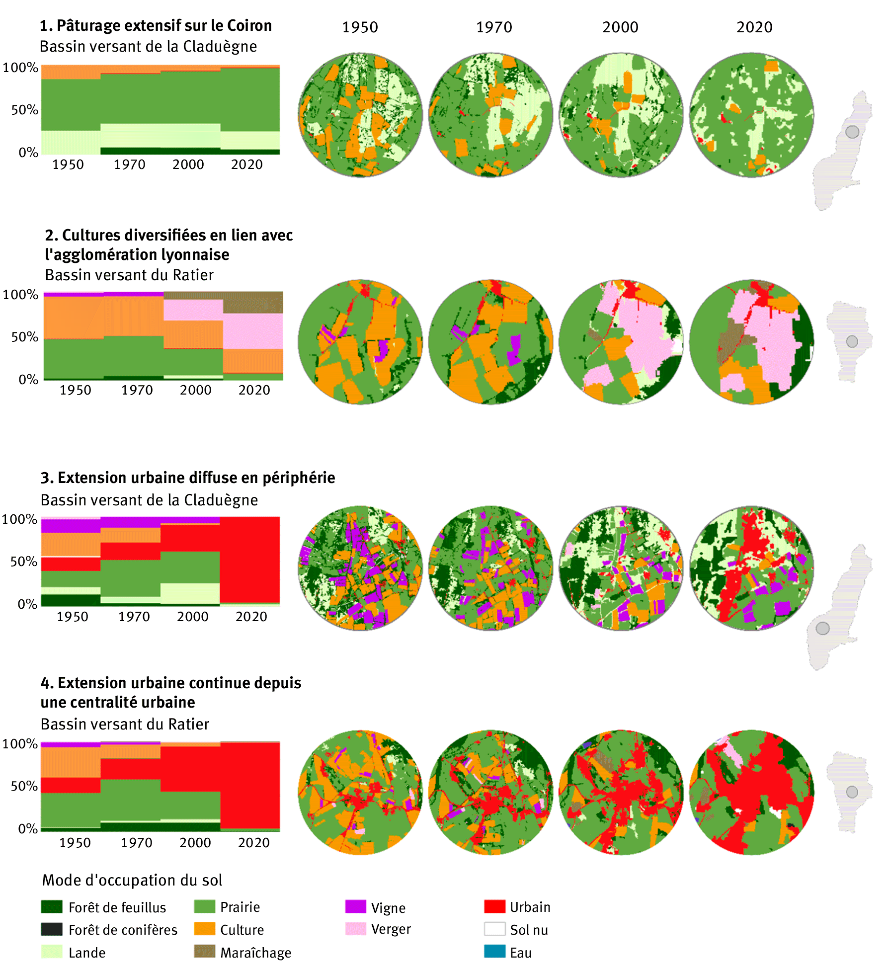 Figure 3. Chronogrammes et cartouches paysagères de quatre sites représentatifs des contaminations des deux bassins versants étudiés : pâturage extensif sur le Coiron (Claduègne), cultures diversifiées à proximité de l’agglomération lyonnaise (Ratier), étalement urbain en périphérie et en dehors des noyaux urbains existants (Claduègne), étalement urbain à partir des centre-bourgs (Ratier).