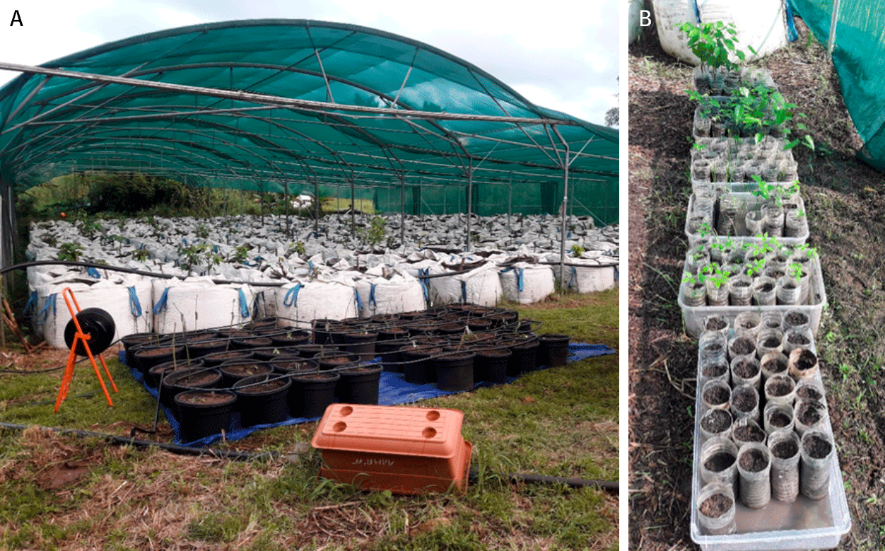 Photo 1 – Dispositif expérimental. Station expérimentale INRAE de Duclos, Guadeloupe. A : boutures de ligneux et semi ligneux en conteneur à l’arrière-plan. Au premier plan, boutures d’herbacées et d’arbrisseaux héliophiles. B : plantules de légumineuses.
