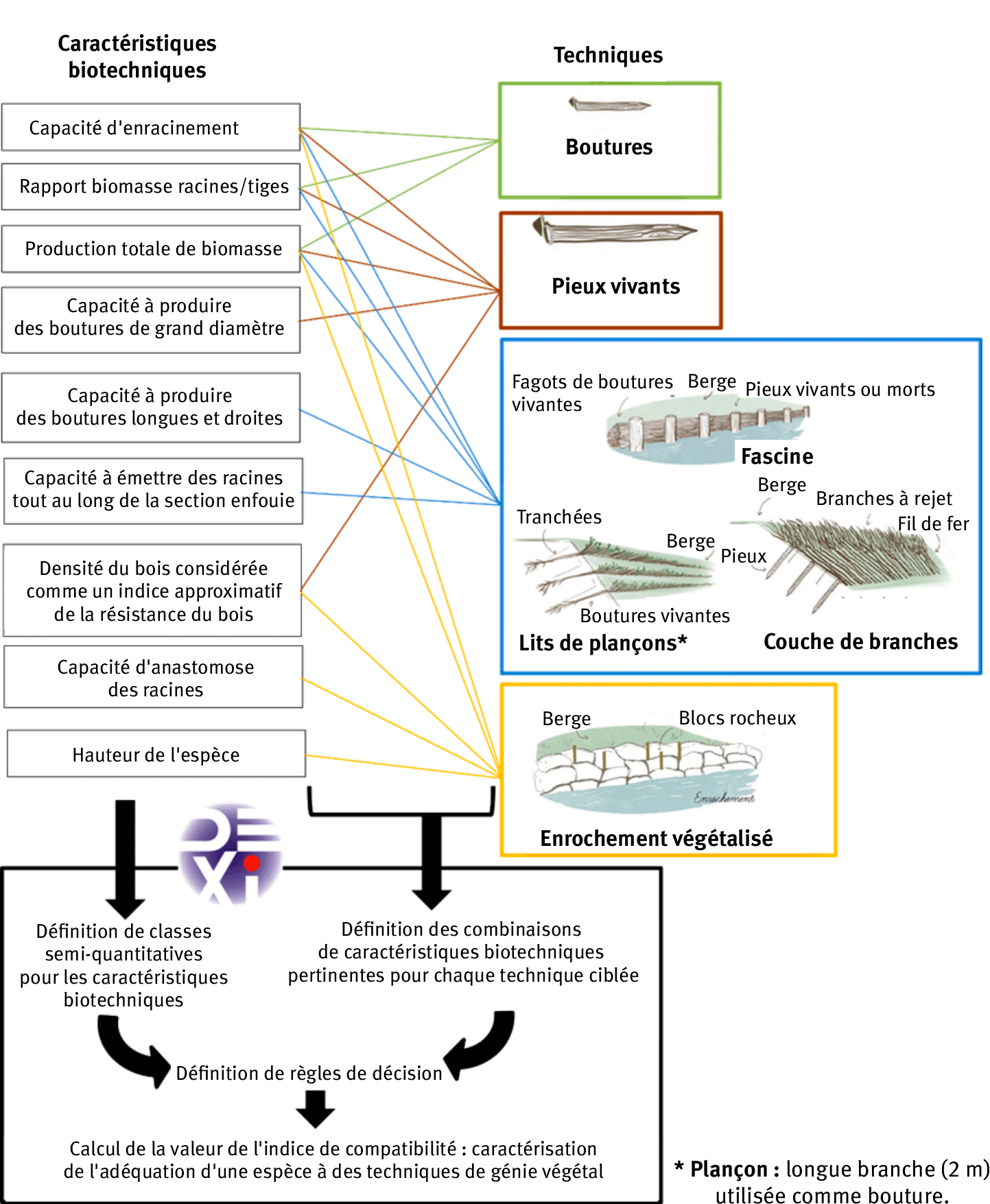 Un indice de compatibilité des espèces ligneuses et semi ligneuses avec les principales techniques de génie végétal a été élaboré à l'aide du programme DEXi. Ce logiciel de modélisation multi attribut d’aide à la décision présente l'avantage d’inclure plusieurs types d'informations, telles que des mesures de terrain ou des connaissances empiriques formulées directement en valeurs qualitatives (Bohanec et al., 2004). DEXi permet d’agréger l’information de données quantitatives ou qualitatives ayant des unités différentes afin d’obtenir un indice semi-quantitatif.